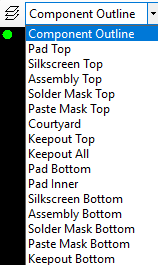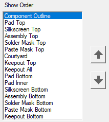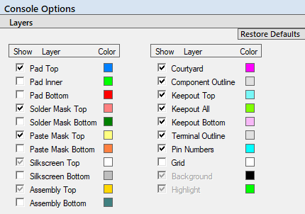- This toggle button turns layers on/off. The default layers are turned on, but you can turn on/off any layers you want to see in the Footprint Calculator and FP Designer. Most Bottom layers are turned off by default because surface mount footprints do not have features on the bottom layer. If you do a lot of through-hole library parts, you may want to turn on the bottom layers.