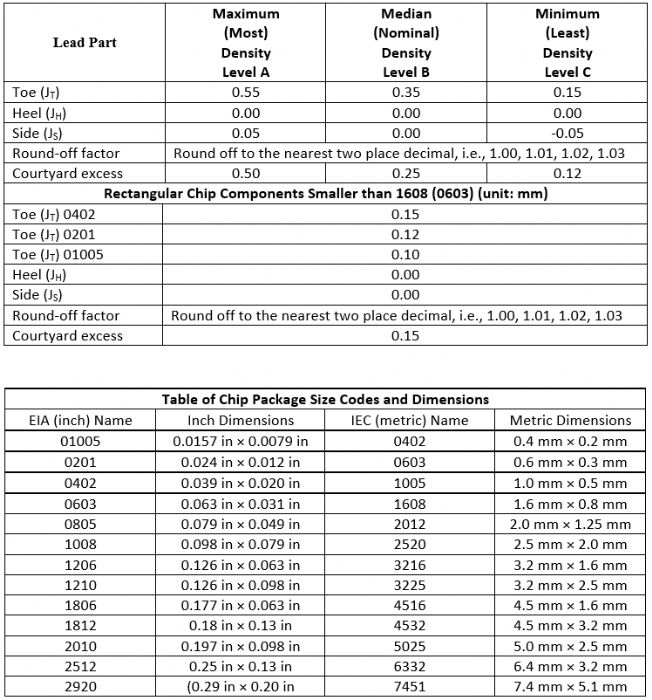 I was trying to find recommended land pattern design for the most popular packages like 0603, 0805, SO8 etc. but it turns out to be pretty difficult. I found IPC-7351 and its 3-Tier approach but don’t really understand how can I calculate correct pad sizes using these values. Also I've seen PCB Library Expert SMD Reference Calculator but it returns incorrect values - try to enter 1608 (EIA 0603) package dimensions L=1.6, T=0.35, W=0.3 with ±0.15mm tolerance as found in Kemet datasheet http://www.kemet.com/Lists/ProductCatalog/Attachments/351/KEM_CC103_AUTO_SMD.pdf and calculated pads will overlap. Finally I've found information that ModelSource libraries available to download for DesignSpark are created to the IPC-7351 standard. However supposedly also based on IPC-7351 Kemet land pattern design recommendations in document mentioned above (page 12) is slightly different than these in ModelSource. By the way Kemet recommendations are also slightly different for 1005 (EIA 0402) than these in this topic. I know the differences are not big and in real life probably doesn’t matter but would be nice to keep land patterns the same across the industry. So I'm really surprised there are no exact dimensions specified e.g. in IPC-7351 for the most popular packages. |