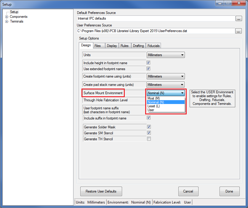 It depends on which version of Library Expert you are using (Pro or Lite) as to where you change the Environment. If you are using Library Expert Lite you change the Environment in the "Terminal > Environment" tab. If you are using Library Expert Pro you change the Environment in "Setup Preferences > User Preferences > Design > Surface Mount Environment > Drop Down" - |