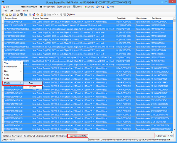 In the past 10 years since we've been creating IPC Footprint Calculators and Library Management documentation tools, I've never heard of anyone deleting thousands or even hundreds of Rows from an FPX file. Normally, you would select the parts you want to keep and RMB select Copy and open a new Library and RMB Paste / File Save As / New Name . FPX I opened the Texas Instruments FPX file with 75,702 parts and I selected all the Rows and RMB delete and it took 8 minutes. I tried the same thing with SM.fpx with 3,000 parts and it took 10 seconds.