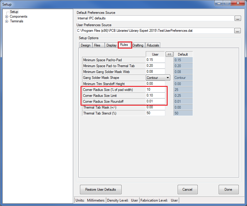 User Setup Rules Corner Radius Size 10% (Default 25) and limit set to 0.10 (Default 0.25)