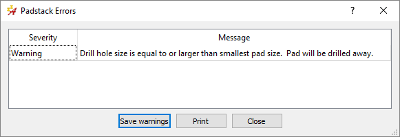 NOTE: Non-plated pad stacks will always have a pad smaller than the drill. With this checked, those warnings will be automatically bypassed. If you do not do this, you will need to save the pad stack with warnings. A process which must follow Section 3 exactly.