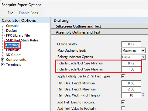 The assembly pin 1 polarity markings include a Dot, Circle, Chamfer and Bar. Polarity indicators scale themselves to the part size within defined user or hard-coded minimum and maximum limits. The dot and circle sizes are equal to the lesser of body length or width, not to exceed the circle/dot minimum and maximum limits. Here are the Options for setting