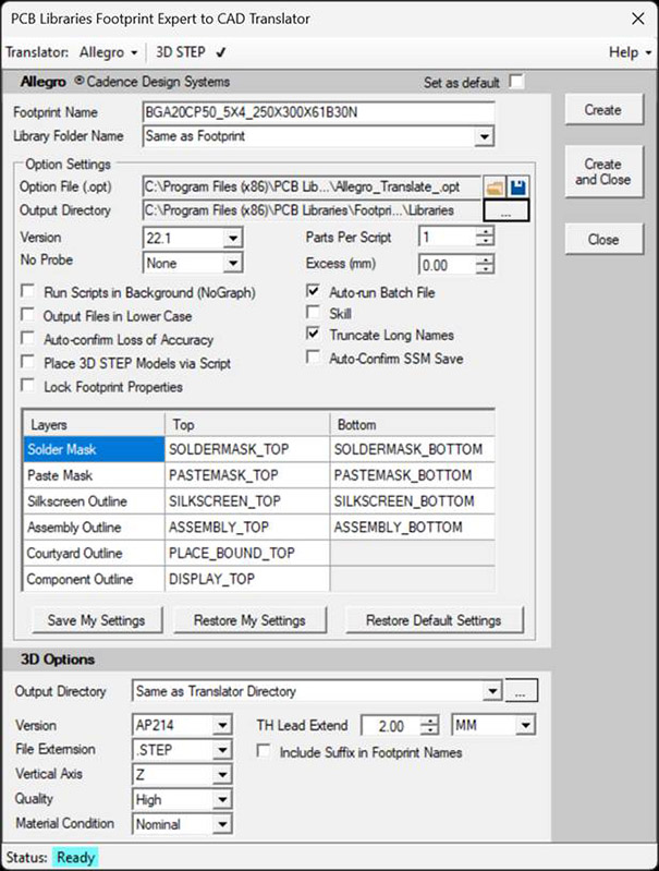 - Place 3D STEP Models Via Script: This is only usable if your license for Allegro supports 3D Modeling. If it does not, turn this off. If it does, what this will do is insert the model (for any standard component package) into the footprint just before script completion.