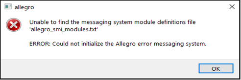 - Error Messaging System: If you get "ERROR:Could not initialize the Allegro error messaging system." - perhaps with reference to messaging system module definitions file 'allegro_smi_modules.txt', it could be that the Cadence env file/environment file is somehow corrupted. Try to delete the env file so that Cadence creates a new one from scratch.