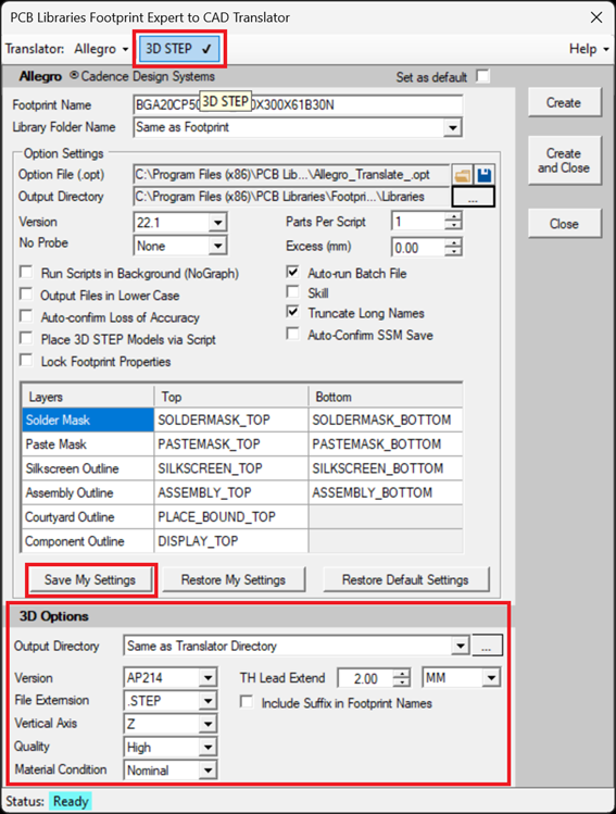 These steps specify the configurations needed to have the Footprint Expert output Footprints and 3D STEP models into Allegro or OrCAD PCB.